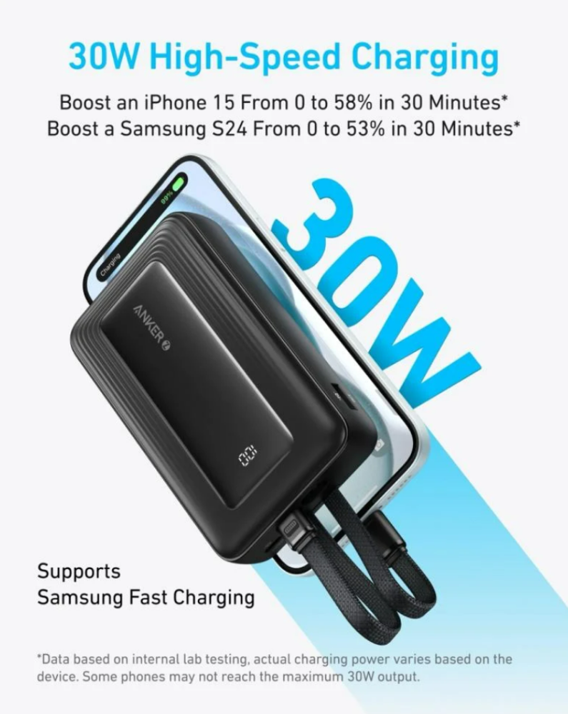 - مع شحن عالي السرعة بقوة 30W، يمكنك شحن iPhone 15 إلى 58% أو Samsung S24 إلى 53% في 30 دقيقة فقط.
