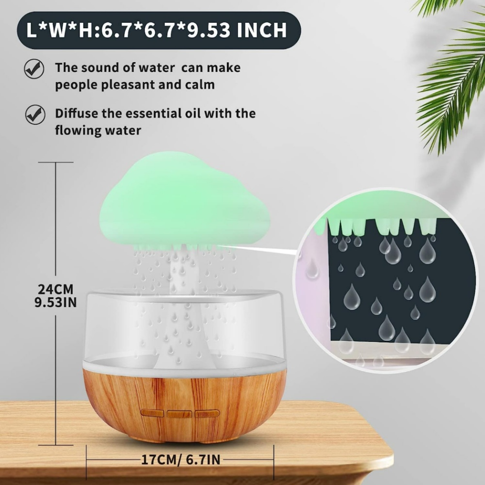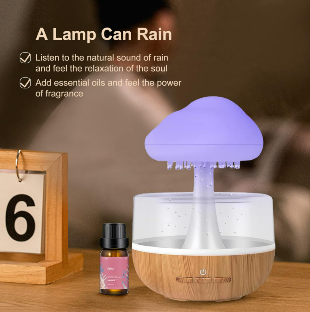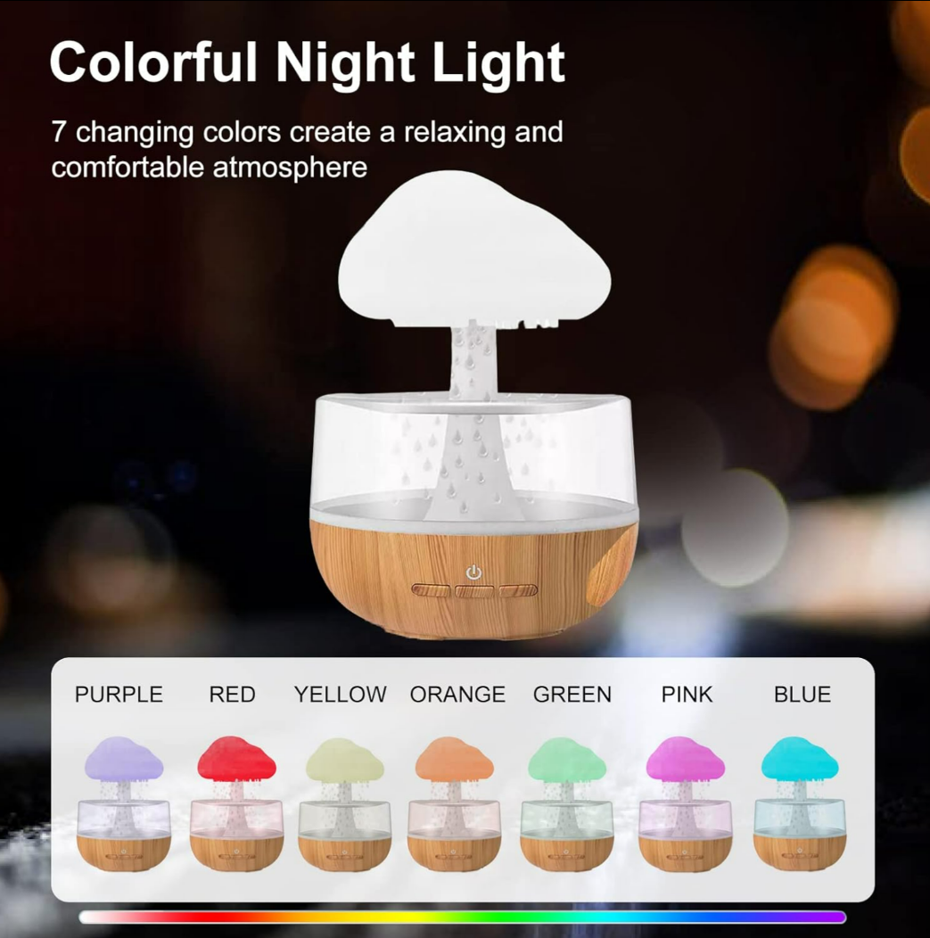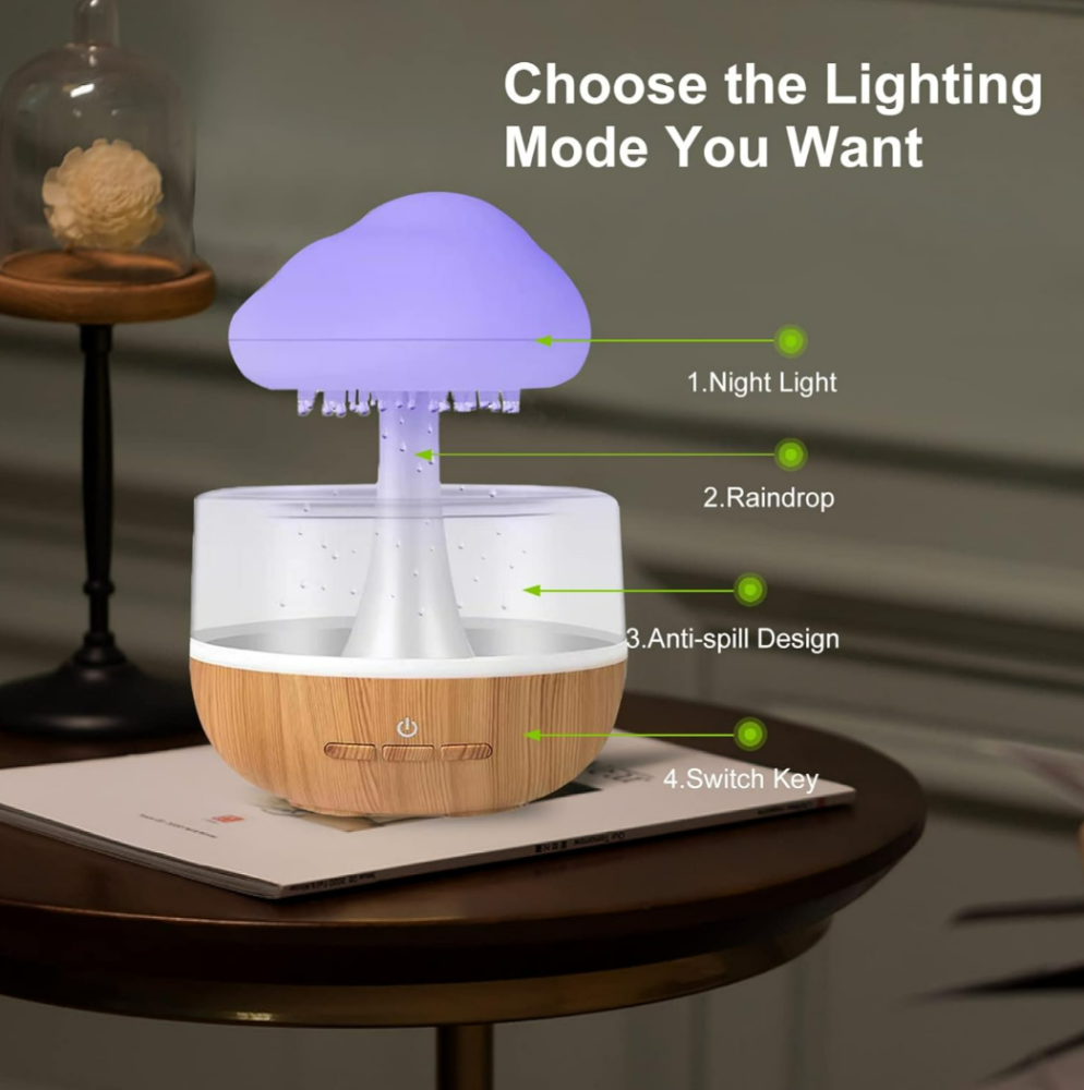 فواحة عطرية ذكية على شكل سحابة ممطرة مع صوت قطرات المطر ليساعد على تخفيف التوتر وتنقية وترطيب الهواء بروائح منعشة ، تحتوي على 7 إضاءات ليلية. وتعمل على توزيع الروائح في المكان بشكل قوي وفعال