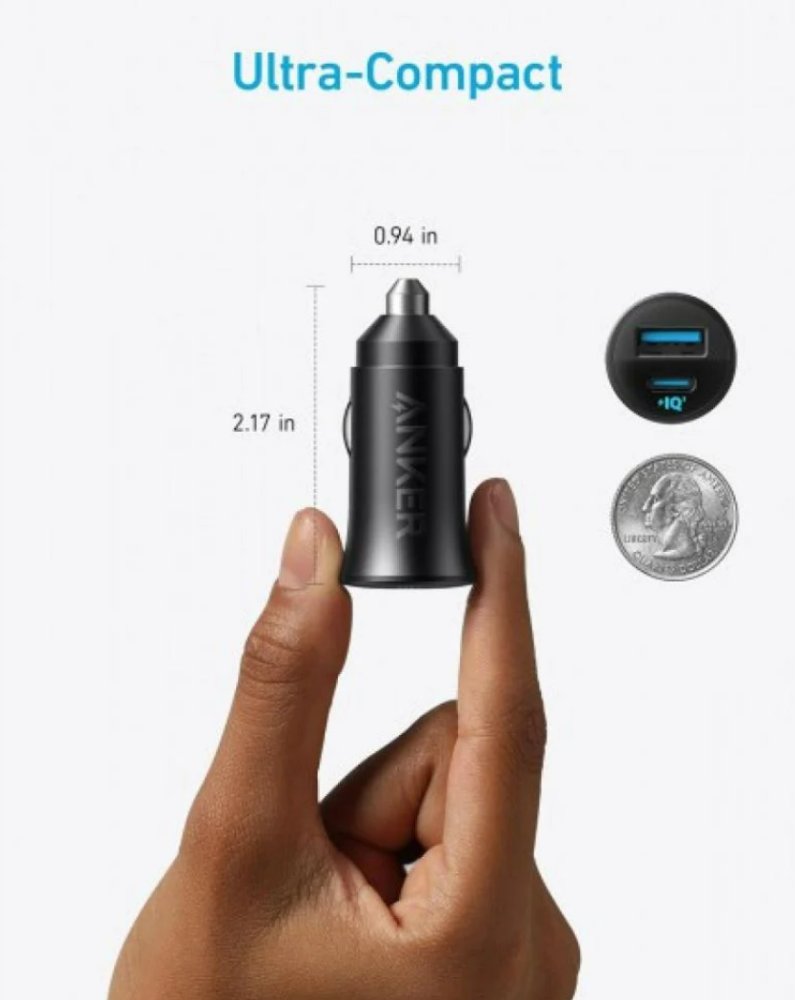 شاحن سيارة انكر بمنفذ تايب سي ومنفذ يو اس بي بقوة 30 واط - اسود