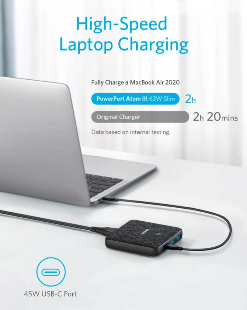مع منفذي PD ومنفذين USB يوفران إجمالي 63 واط من الطاقة ، يمكنك الآن شحن هاتفك وجهازك اللوحي والكمبيوتر المحمول والمزيد – كل ذلك في نفس الوقت.
