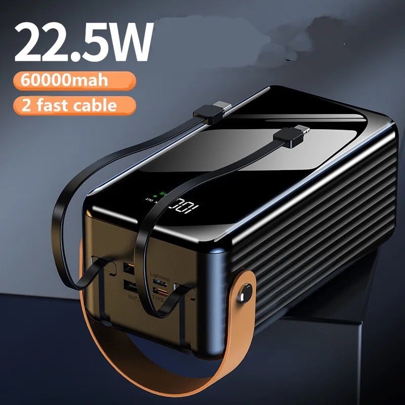 Portable battery power bank with a capacity of 50,000 mAh, with a PD Type-C port, an iPhone Lightning port, and two USB ports that support fast charging